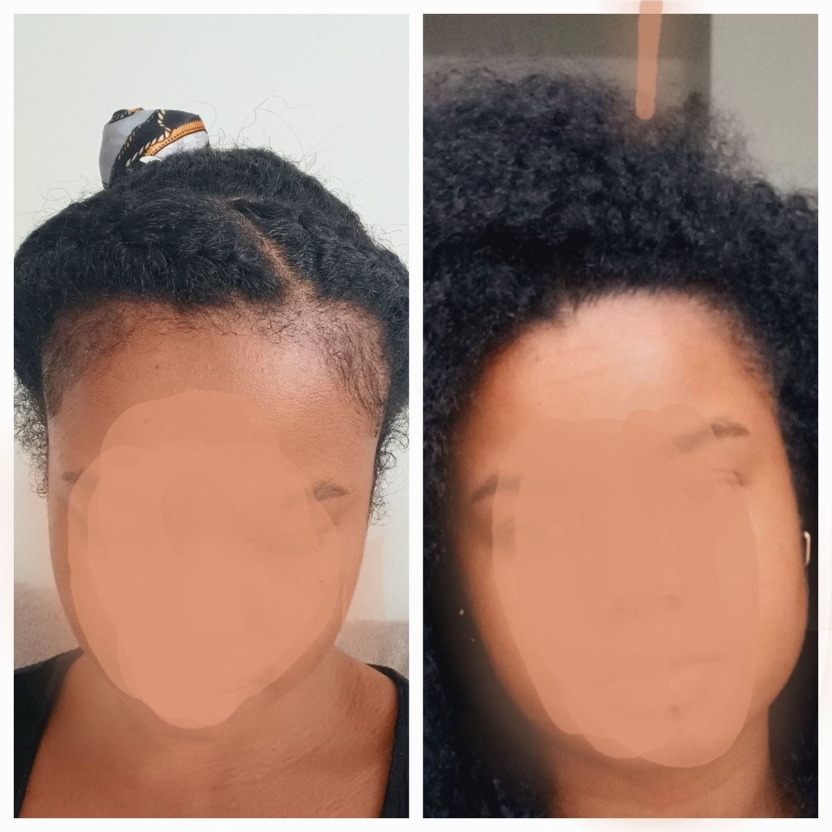 "Après mon accouchement, mes tempes s'étaient complètement dégarnies. C'était la première fois que je vivais une telle chute et j'avais perdu confiance en voyant mon front doublé de volume. Avec la patience, mes soins naturels et beaucoup de douceur, mes cheveux ont retrouvé force et volume. Cette photo avant après en est la preuve."